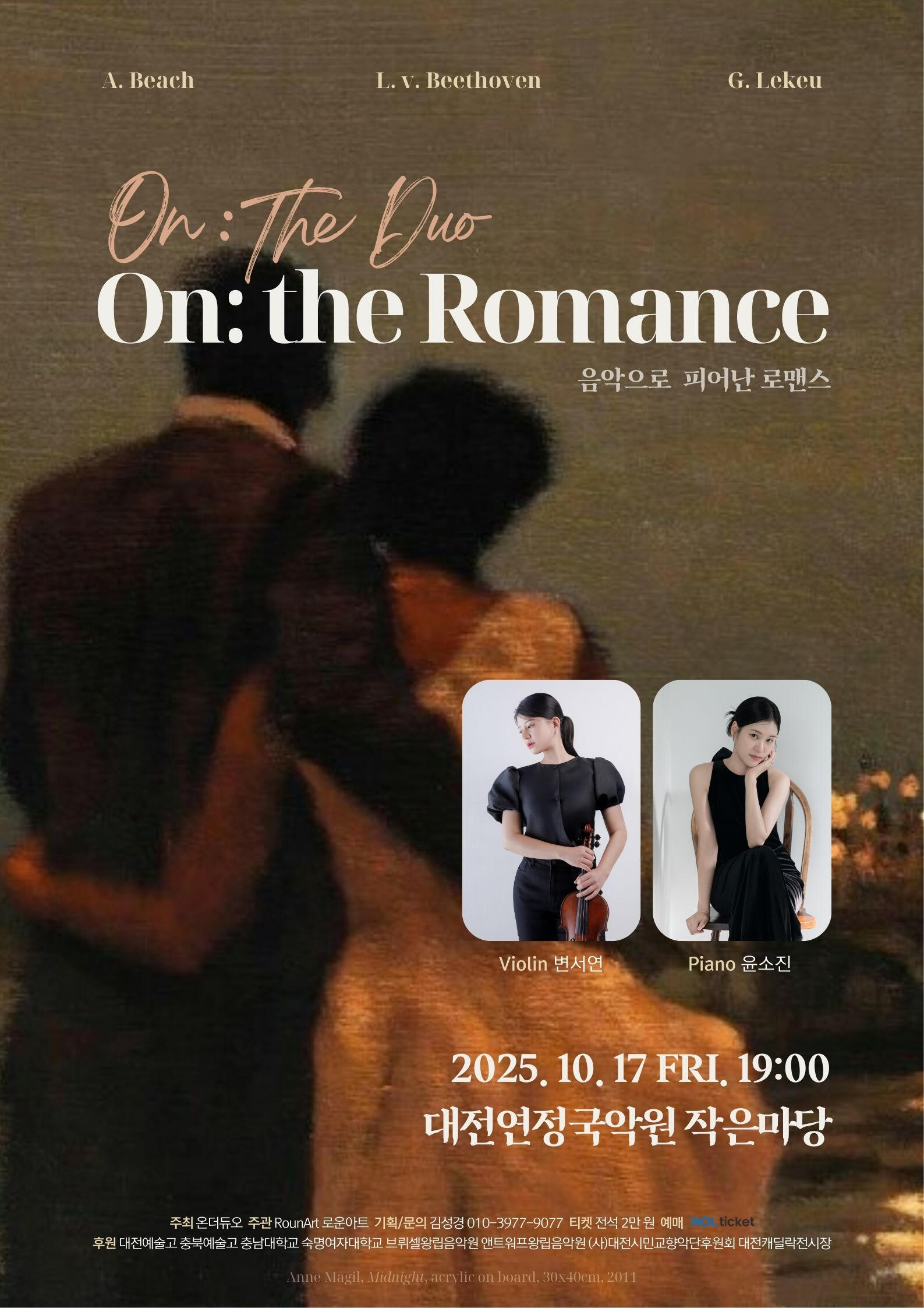〈On The Romance〉는 바이올린과 피아노 듀오 온더듀오가 오랜 협연을 통해 축적해 온 정교한 앙상블과 깊이 있는 해석을 바탕으로, ‘Romance(로맨스)’라는 주제 아래 바이올린과 피아노 듀오 레퍼토리의 서정성과 감정적 밀도를 집중적으로 조명하는 연주회입니다. 본 공연은 고전주의에서 낭만주의에 이르기까지 각 시대의 음악이 사랑과 열정, 고뇌와 희망이라는 감정을 어떻게 음악적으로 형상화해 왔는지를 실제 연주를 통해 생생하게 드러내며, 특히 국내에서 잘 알려지지 않은 벨기에 작곡가 Lekeu의 바이올린 소나타를 중심 작품으로 삼아 온더듀오의 음악적 정체성과 해석 방향을 분명히 제시합니다. Lekeu 특유의 농밀하고 서정적인 선율은 바이올린과 피아노의 긴밀한 호흡 속에서 극대화되며, 이를 통해 로맨스가 지닌 복합적인 감정의 결을 섬세하면서도 밀도 높은 연주로 전달합니다. 온더듀오는 단순한 작품 나열이 아닌, 연주 자체를 중심에 둔 음악적 스토리텔링을 통해 관객이 각 작품의 감정 흐름과 시대적 배경을 자연스럽게 따라갈 수 있도록 하며, 바이올린과 피아노가 만들어내는 깊은 대화를 통해 클래식 음악의 인간적이고 보편적인 감동을 진정성 있게 전하고자 합니다.