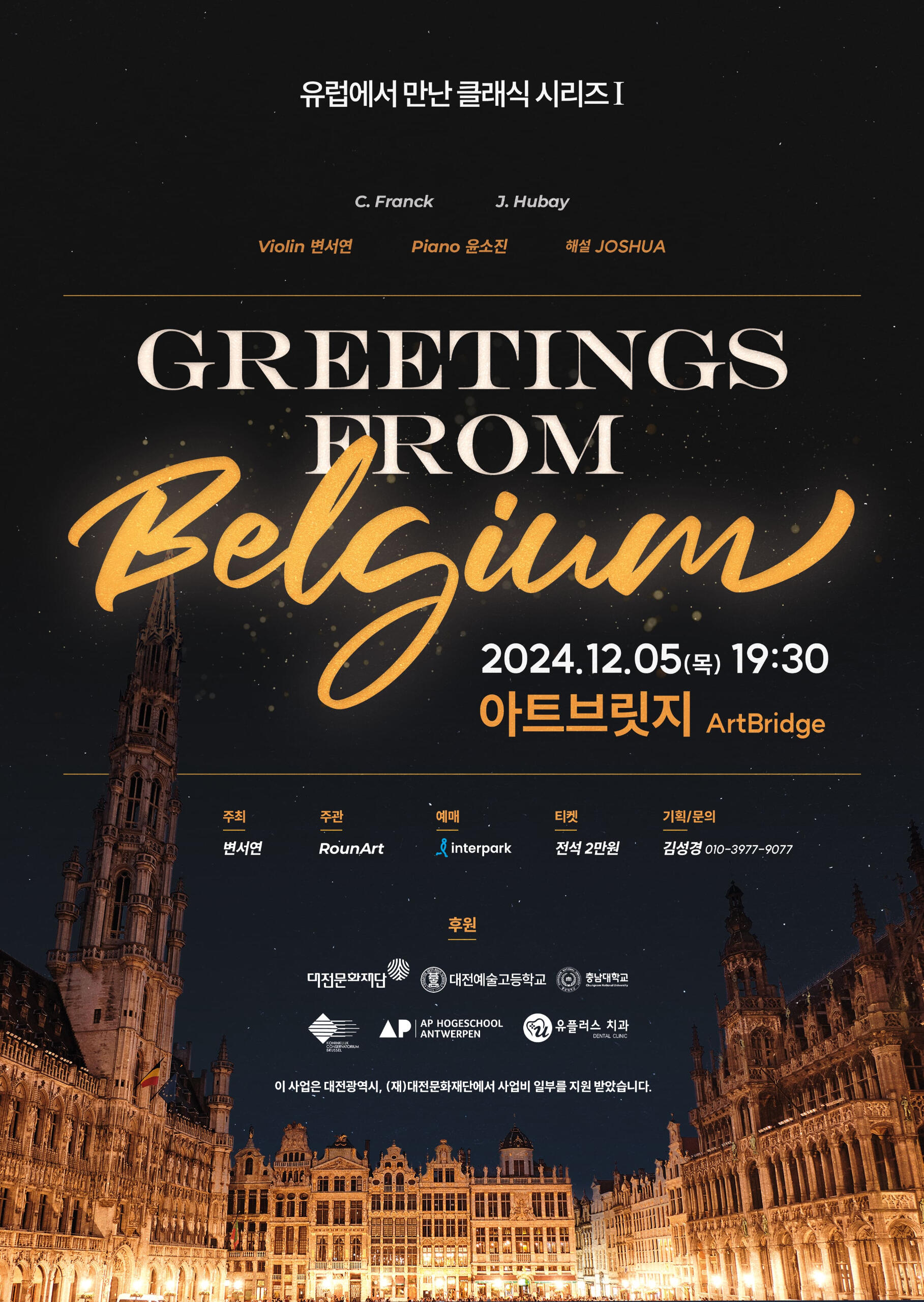 한국에서의 두번째 솔로 리사이틀이자, 한국에 온지 단 4개월 만에 열린 이 무대는 대전문화재단의 단독 후원으로 성사된 뜻깊은 공연이었습니다. 벨기에의 보석 같은 작곡가들의 작품을 중심으로, 본인이 직접 촬영한 벨기에의 사진과 영상을 배경에 담아 마치 음악과 함께 여행을 떠나는 듯한 경험을 선사하고자 했습니다. 해설과 함께 음악 이야기, 영상이 어우러져 관객들이 더욱 감상적이고 즐길 수 있었던 리사이틀입니다.
